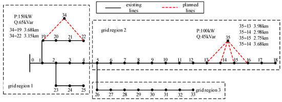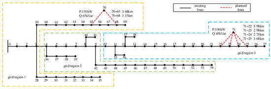 To further verify the effectiveness of the proposed method, the more complex PG&E 69-bus distribution system [33] was tested. The parameter settings were kept consistent with those described in this section. The partitioning results of the 69-bus system and the corresponding line construction plans are shown in Figure 10.