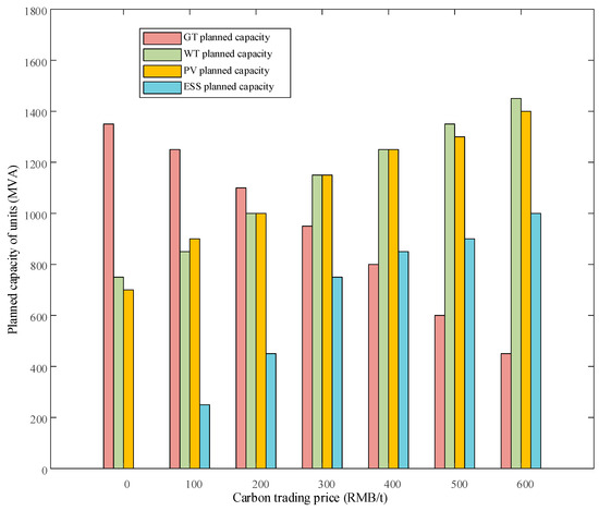 First, the integration of the electricity–carbon coupling mechanism substantially improves the planning performance. By establishing a linkage between electricity prices and carbon trading signals, the model creates a coordinated market environment that guides investment towards low-carbon resources while discouraging carbon-intensive generation. This mechanism not only promotes the utilization of renewable energy but also contributes to the reduction of overall system costs through the mitigation of carbon-related expenditures.
