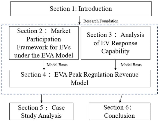 During the dispatch process, the EVA must first assess the aggregate capacity, flexibility potential, and available response windows of its EV fleet in order to determine the maximum dispatchable capacity for peak regulation. Based on these estimations, the EVA then submits bids in the ancillary service market and signs service contracts. Upon receiving dispatch instructions, the EVA executes real-time control by leveraging both its user communication interface and embedded response strategies, thereby coordinating EV charge–discharge behavior with the power system’s operational needs. The structural representation of this interaction is illustrated in Figure 3.