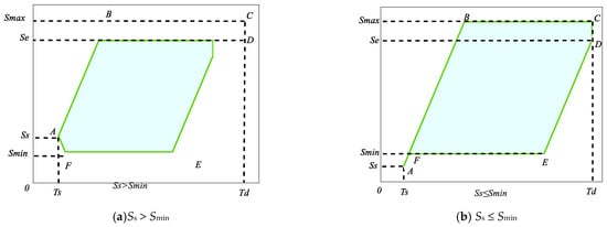 In Figure 4b, if the initial state of charge (SOC) Ss is less than or equal to the minimum SOC Smin, the EV enters a state of over-discharge. In this case, the EV must first charge at its rated power until the SOC reaches Smin before it becomes controllable. If charging resumes at rated power once the SOC reaches Smin, the charging boundary is defined by the trajectory A–F–B–C.