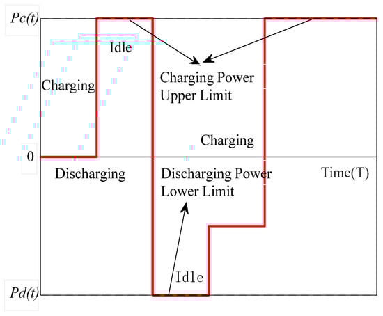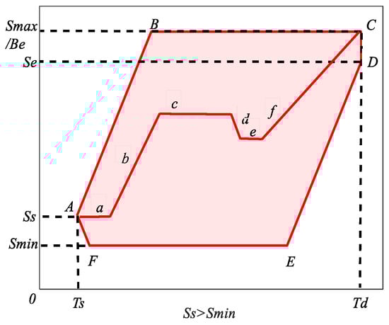 In Figure 4a, when the initial state of charge (SOC) of the EV, denoted as Ss, exceeds the minimum SOC threshold Smin set to prevent excessive battery discharge, the EV begins charging at its rated power immediately upon connecting to the grid at time Ts. Once the SOC reaches the maximum allowable limit Smax, the EV transitions to an idle state. In this scenario, the upper charging boundary is defined by the trajectory A–B–C.