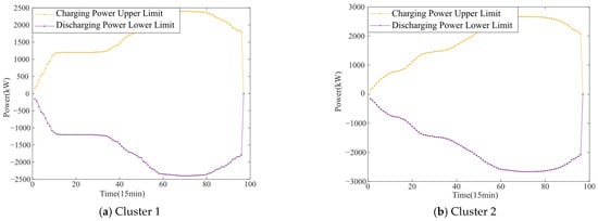 By repeatedly sampling a specified number of EVs, two controllable aggregations were formed, and the cumulative sampling boundary results are illustrated in Figure 8a,b. In Aggregation 1, the EV charging behaviors are relatively uniform, with most vehicles charging intensively during nighttime hours. This leads to higher charging/discharging power during the night and a steadily increasing SOC over time, consistent with the trend in charging power. In Aggregation 2, due to differences in initial charging power, charging demand, and driving patterns among individual EVs, the power boundary exhibits greater variability compared to Aggregation 1. Correspondingly, the SOC boundaries show distinct phase-based fluctuations. By comparing the power and SOC boundary characteristics of the two aggregations, it can be observed that Aggregation 1 exhibits more homogeneous charging behavior, whereas Aggregation 2 demonstrates greater diversity. These contrasting boundary features effectively reflect the flexibility of EV aggregations in the dispatch process. Figure 8a,b reveal significant behavioral differences between electric vehicle (EV) user clusters. Cluster 1 exhibits a more concentrated and regular nighttime charging pattern (22:00–06:00), characterized by high synchronicity and strong predictability. This group likely corresponds to private car owners with fixed commuting routines and access to stable overnight charging conditions. Their behavioral characteristics are broadly consistent with users from middle to high income levels, demonstrating greater temporal consistency and stronger coordination in response behavior.