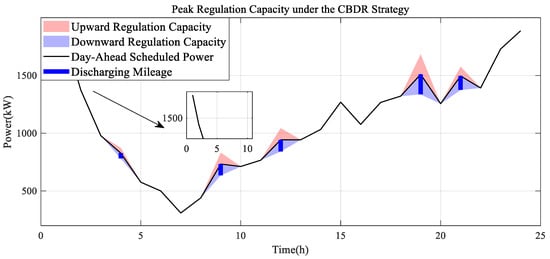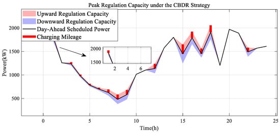 Based on the preceding evaluation of the energy distribution within EV aggregations, this section further analyzes the real-time peak regulation margin in different strategic scenarios, as illustrated in Figure 12, Figure 13 and Figure 14. Scenario 1 considers only the CBDR strategy, where the EVA adjusts charging behavior in certain time periods based on price signals and peak regulation demand, thereby reducing electricity procurement costs and providing a degree of downward regulation margin. Scenario 2 incorporates the DBDR strategy, enabling EVs to discharge in specific time slots and release upward regulation capacity. Scenario 3 integrates both the CBDR and DBDR strategies, allowing the EVA to balance both upward and downward regulation requirements simultaneously.