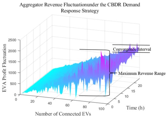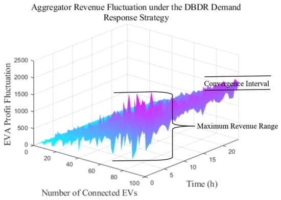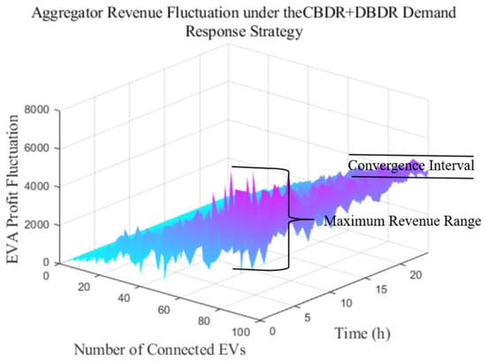 In the three scenarios presented in Table 4, the EVA’s revenue performance varies accordingly. As the number of EVs participating in peak regulation increases, the EVA’s total revenue exhibits an overall upward trend. However, once the number of connected EVs reaches the maximum controllable threshold of the EVA’s management region, further revenue growth becomes constrained by limitations in EV quantity, energy, and power capacity, and thus begins to stabilize. With the different strategies, the overall revenue performance follows the following pattern: CBDR < DBDR < CBDR + DBDR. CBDR relies on predefined price discounts; although it provides stable returns, its growth potential is limited. DBDR, influenced by discharging subsidies, achieves relatively higher user participation and allows the EVA to receive partial compensation through ancillary services, resulting in a wider revenue range than CBDR alone. In the combined CBDR and DBDR scenario, the two mechanisms are complementary, enabling the EVA to achieve more refined regulation and response control. This leads to the highest revenue potential among all strategies. However, revenue growth is still subject to constraints imposed by EV charging/discharging capabilities and the EVA’s energy boundaries. Once the total number of connected EVs reaches saturation, revenue again stabilizes, as illustrated in Figure 15, Figure 16 and Figure 17. Compared with Scenarios 1 and 2, Scenario 3 offers significantly greater revenue potential.