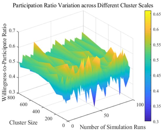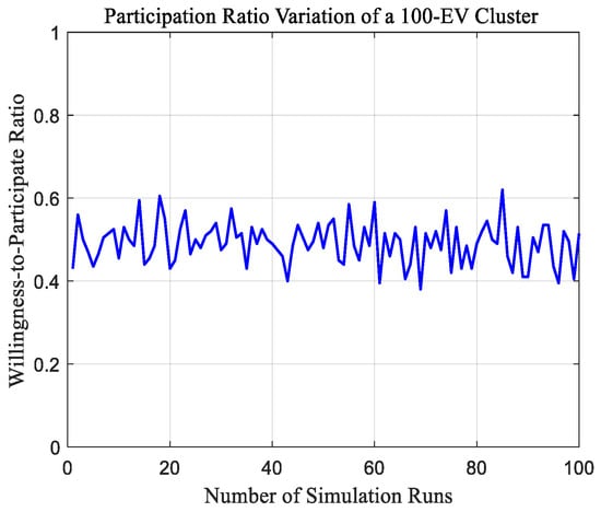Moreover, although this study primarily focuses on the temporal coordination strategy of EV aggregators within ancillary service markets, it is imperative to recognize that large-scale deployment of EVAs introduces additional operational complexities and systemic dynamics that merit further investigation. As the penetration level of EVs increases, the aggregation size expands accordingly, leading to amplified challenges in accurately forecasting user behavior, maintaining real-time communication reliability, and managing computational scalability in dispatch optimization. Moreover, spatial–temporal diversity across a larger population exacerbates uncertainties in energy availability and response consistency, potentially diluting the overall effectiveness of incentive-based demand response schemes. From a system perspective, high-density EVA deployment may also influence local grid stability, transformer loading, and congestion management, particularly in distribution-level networks. These phenomena suggest that EVA performance metrics—such as regulation capacity, economic return, and user participation rates—may exhibit nonlinear or saturation effects in high-adoption scenarios. Therefore, future research should extend the current model to incorporate grid-constrained EVA coordination, peer-to-peer interactions among EV clusters, and adaptive learning mechanisms for real-time control. Despite these prospective extensions, this paper remains centered on developing a tractable and behaviorally grounded scheduling framework tailored to medium-scale aggregation scenarios. The presented methodology establishes foundational insights that can be incrementally scaled and validated in follow-up studies targeting ultra-large EVA networks.