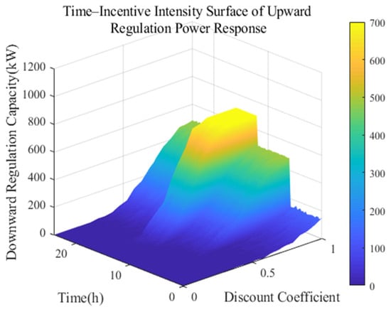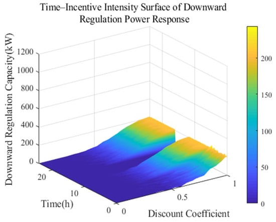 Figure 18 shows the variation in individual response durations when 100 EVs are subjected to upward regulation signals. The results reveal significant differences across users, with an average duration of approximately 0.4 h. The maximum and minimum response times differ by more than a factor of two, indicating strong behavioral heterogeneity. This characteristic provides a modeling basis for the subsequent implementation of tiered incentive mechanisms and precision dispatch strategies. Figure 19 examines the variation in EV aggregation participation rates under different combinations of initial states of charge (SOCs) and incentive pricing. The simulation results show that when the SOC is at a medium to high level and the incentive price aligns closely with user expectations, the overall participation rate increases significantly. Insufficient compensation fails to cover the perceived cost of participation, while overly high compensation may raise concerns about potential risks, causing some users to refrain, resulting in a “mid-range optimum” participation structure. Figure 20 and Figure 21 present the distribution of upward and downward response power, respectively, under varying time intervals and discount coefficients. In the upward regulation scenario, the response power increases rapidly between 10:00 and 16:00, and higher incentive coefficients correlate with stronger response capability. In contrast, downward regulation responses are concentrated between 18:00 and 22:00, with a stepwise increase in power that forms a plateau-like structure. This indicates that downward responses are more dependent on strong price signals and exhibit higher price sensitivity.