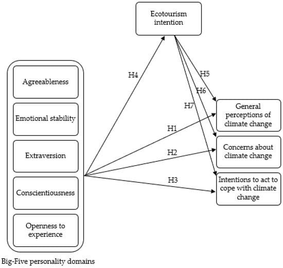 Extraversion, which reflects sociability and an interest in group activities, can be associated with the enjoyment of interpersonal interactions that come with shared experiences in nature and a tendency toward group-based ecotourism activities [65]. Studies suggest that extraverted individuals are more likely to have a higher ecotourism intention [20,46,61,66]. On the other hand, Extraversion, a personality trait generally associated with sociability, assertiveness, experiencing positive emotions, and a tendency to enjoy the present moment, may reduce individuals’ perception of climate change as a personal or urgent threat [67]. Therefore, extraverted individuals are expected to have lower levels of general perceptions and concern regarding climate change. Moreover, the optimism and emotional resilience typically displayed by extraverted individuals may serve as a psychological buffer against distressing messages such as those related to climate change. Nevertheless, due to their high energy levels, desire for social interaction, and inclination toward group-based activities, these individuals may score high in terms of their intention to take environmental action [68]. In this context, their intention to act may be driven more by the behavioral activation and social participation tendencies inherent in Extraversion, rather than by direct concern. Based on this, the present study proposes that Extraversion is negatively associated with perceptions and concerns about climate change, while being positively associated with the intentions to act to cope with climate change and ecotourism intentions.