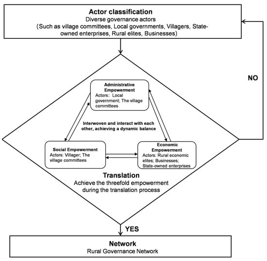 - Governance network: The rural governance network results from key actors engaging in a process of translation to achieve a dynamic balance among administrative, social, and economic empowerment. These three dimensions of empowerment work in tandem, mutually reinforcing one another to sustain the network’s efficiency. When insoluble dissidence emerges, preventing actors from sustaining this balance, their roles and interactions become disordered, ultimately leading to the network’s disintegration. At this point, governance structures, roles, and relationships are reorganized to adapt to new circumstances, and the translation process is repeated to re-establish threefold empowerment, reconstructing the governance network.