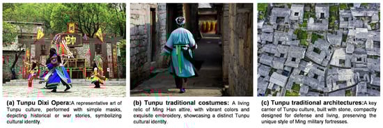 Illustration of Tunpu culture. (a) Tunpu Dixi Opera (b) Tunpu traditional costumes (c) Tunpu traditional architectures.