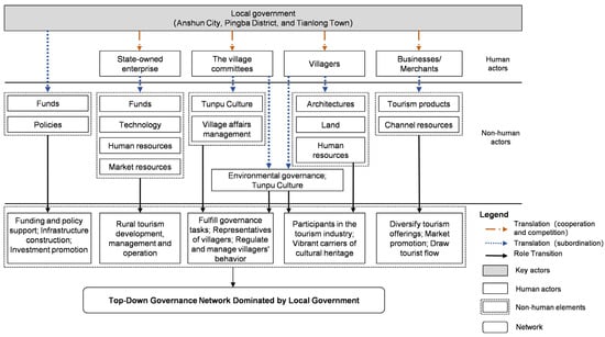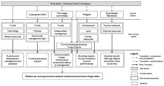 As rural tourism transitions from concept to reality, a diverse range of actors has become involved in rural governance. Human actors include rural elites, local governments, village committees, villagers, and businesses or merchants. Non-human actors consist of elements like Tunpu culture, architecture, land, and landscapes. Table 2 provides a detailed classification of these actors.
