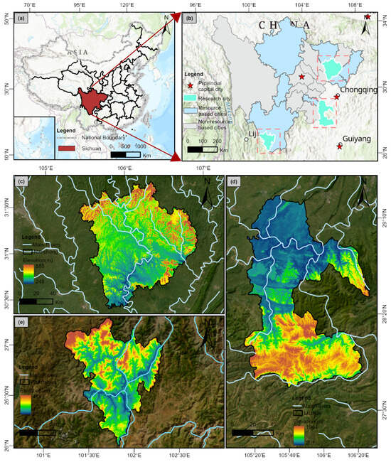 Sichuan Province (26°03′ N–34°19′ N, 97°21′ E–108°31′ E), located in the upper reaches of the Yangtze River in southwestern China, covers an area of approximately 486,000 km2 (Figure 1a) and is endowed with abundant and diverse natural resources. Under the National Sustainable Development Plan for Resource-Based Cities (2013–2020) issued by the State Council, Sichuan is identified as having 10 resource-based cities: Guangyuan, Nanchong, Dazhou, Guang’an, Zigong, Luzhou, Ya’an, Panzhihua, Aba Tibetan Autonomous Prefecture, and Liangshan Yi Autonomous Prefecture (Figure 1b). Due to data accessibility constraints, the analysis centers on prefecture-level cities in Sichuan, excluding Aba and Liangshan, due to their relatively low industrialization and marginal roles in the province’s broader resource-oriented development planning. Three representative cities—each exemplifying a distinct developmental typology—were selected from the northeastern, southeastern, and southwestern regions of the province (Figure 1c–e). Nanchong (30°10′ N–32°20′ N, 105°27′ E–107°28′ E), the only growing-type city in Sichuan, serves as the economic hub of northeastern Sichuan. It features a subtropical monsoon climate, with an economy that is historically centered on agriculture and is increasingly driven by the development of natural gas resources. Luzhou (27°39′ N–29°20′ N, 105°08′ E–106°28′ E), designated as a declining-type city, lies at the intersection of the Sichuan Basin and the Yunnan–Guizhou Plateau. It experiences four distinct seasons. Once a national hub for natural gas-based chemical production, Luzhou was classified as resource-depleted in 2011 due to the exhaustion of its gas reserves. In response, the city has shifted the baijiu (liquor) industry, which now serves as its primary economic pillar. Panzhihua (26°05′ N–27°05′ N, 101°08′ E–102°15′ E), identified as a mature-type city, is situated at the confluence of the Hengduan Mountains, the Yunnan–Guizhou Plateau, and the Sichuan Basin. It is characterized by complex topography, dense river networks, and a distinct seasonal climate with an annual precipitation of approximately 850 mm. Panzhihua is globally recognized for its extensive reserves of vanadium–titanium magnetite (estimated at 6.64 billion tons), coal (approx. 3.45 million tons), and abundant solar and geothermal energy resources. It is the world’s largest producer of vanadium and the leading center of titanium production in China [23].