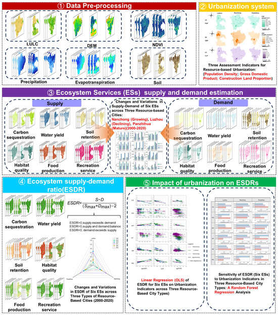 To address these gaps, this study selected three representative resource-based cities in Sichuan—Nanchong (growing), Panzhihua (mature), and Luzhou (declining)—to answer two core questions: (1) How do ES supply–demand patterns differ among the city types in terms of deficits and surpluses, and how have these patterns evolved spatiotemporally? (2) How does urbanization influence ESs’ supply–demand balance—does it alleviate or exacerbate mismatches? How does the sensitivity of different ESs to urbanization vary across city types? To answer these questions, we analyzed the dynamics of six ESs—soil retention (SR), carbon sequestration (CS), water yield (WY), habitat quality (HQ), food production (FP), and recreational services (RS)—from 2000 to 2020. Ordinary least squares (OLS) regression was employed to quantify the directional effects of urbanization on ES supply–demand matching, while random forest (RF) models were used to assess the heterogeneity in urbanization sensitivity across city types. This study provides a scientific basis for formulating differentiated policies, facilitating green transitions, and strengthening ecological governance in resource-based cities.