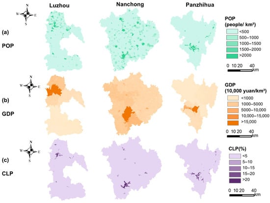 Spatial distribution of urbanization levels in Luzhou (declining), Nanchong (growing), and Panzhihua (mature) in 2020: (a) Population density (POP, persons/km2), (b) GDP density (GDP, 104 CNY/km2), and (c) construction land proportion (CLP, %).