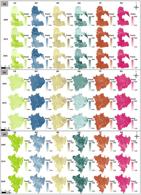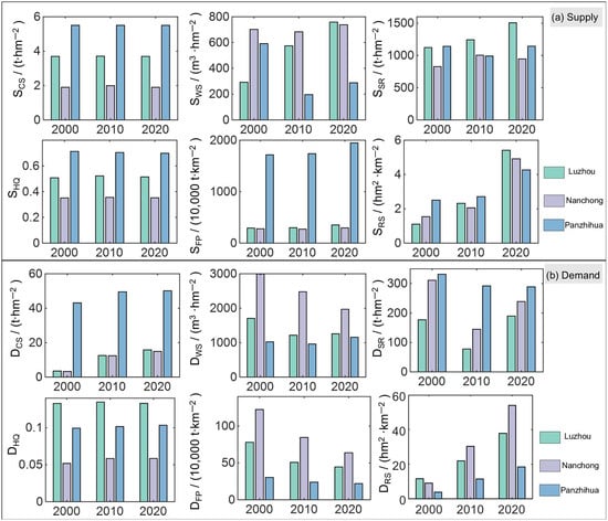 As illustrated in Figure 4 and Figure 5, the spatiotemporal evolution of ESs’ supply from 2000 to 2020 exhibited distinct variations among the three resource-based cities—Luzhou (declining), Nanchong (growing), and Panzhihua (mature). In Luzhou, the southeastern hilly and mountainous zones were the primary areas of concentrated ES supply. CS remained stable at approximately 3.7 t·hm−2, while HQ was maintained around 0.51. Regulating services showed remarkable improvement: SR increased by over 34%, from 1123 to 1507 t·hm−2; WY, which was mainly distributed in the northern and southern regions, surged from 292 to 758 m3·hm−2, representing a 160% increase—the highest among the three cities—was likely driven by vegetation recovery and forest expansion in previously mined areas. FP increased by about 20%, from 292 to 353 t·km−2. RS also improved significantly, rising from 1.10 to 5.41 hm2·km−2, which was largely attributable to the transformation of abandoned mining sites into ecological parks, reflecting Luzhou’s proactive ecological restoration efforts. In Nanchong, the spatial distribution of ESs’ supply appeared fragmented, with a relatively low contrast between high- and low-value areas. HQ remained at around 0.35, and CS was the lowest among the three cities at approximately 1.99 t·hm−2, possibly due to the rapid expansion of built-up areas. WY consistently remained high, increasing slightly from 702 to 738 m3·hm−2. SR rose from 827 to 946 t·hm−2, a 14% increase. FP experienced minor growth, rising from 278 to 296 t·km−2. RS expanded significantly, from 1.54 to 4.91 hm2·km−2—more than tripling over the period—indicating an increasing demand for recreational space in the context of urban development. In Panzhihua, high ES supply zones are concentrated predominantly in the northern Jinsha River valley and the southern ecological buffer zones. CS remained above 5.50 t·hm−2, and HQ consistently exceeded 0.70, both representing the highest values among the three cities and reflecting the stability of the city’s ecological core. However, WY declined markedly, from 592 to 288 m3·hm−2—a reduction of 51.37%—likely due to ongoing mining activities and intensified agricultural water consumption. Despite its mountainous terrain, FP increased steadily from 1715 to 1946 t·km−2, supported by the development of high-efficiency agriculture. SR fluctuated slightly between 1140 and 1144 t·hm−2, showing no notable trend. Although RS grew from 2.51 to 4.27 hm2·km−2, its total value remained lower than that in Luzhou and Nanchong.