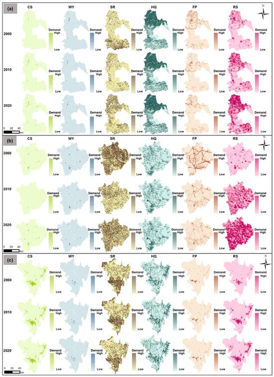 Spatial distribution of the demand for ESs in (a) Luzhou (declining), (b) Nanchong (growing), and (c) Panzhihua (mature) from 2000 to 2020.