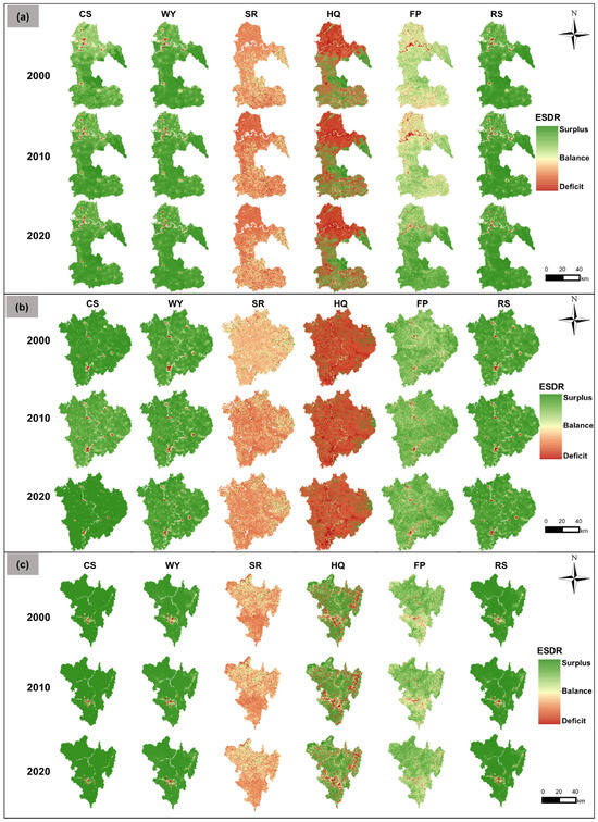 Where the represents the ecosystem service supply–demand ratio. When the ESDR is positive, supply surpasses demand; a negative value implies insufficient supply; and a value near zero indicates equilibrium. Here, and denote the supply and demand of ESs, respectively, while and represent their corresponding maximum values within the study area.