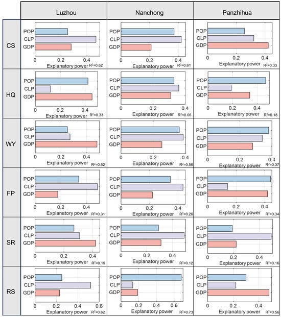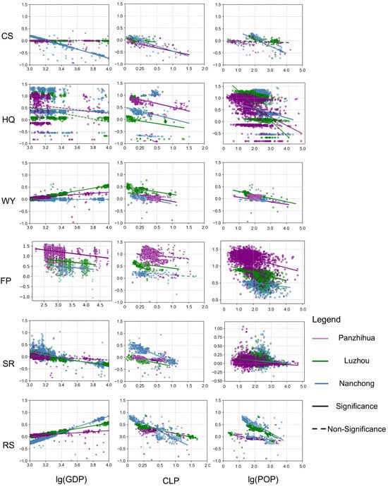 The OLS regression outputs revealed that (Figure 8), the urbanization indicators—GDP, CLP, and POP—generally exhibited negative effects on the ESDR across Luzhou, Nanchong, and Panzhihua. However, substantial variations were observed among the cities and across different types of ESs. In Luzhou, a declining city, GDP exerted positive effects on WY and RS, with a statistically significant impact on WY (R2 = 0.42, p < 0.05). In contrast, GDP had significant negative effects on FP and SR. Although it was also negatively associated with HQ (R2 = 0.33, p > 0.05) and CS (R2 = 0.12, p > 0.05), neither of these associations reached statistical significance. CLP presented statistically significant negative effects on all ESs, with the strongest impacts observed on RS, WY, and HQ. POP had significant negative effects on all ESs except for CS, where the effect was weak and not significant. In Nanchong, a growing city, GDP had significant positive effects on FP, HQ, SR, and WY, although its explanatory power for WY was relatively low (R2 = 0.05, p < 0.05). However, GDP had negative associations with CS, HQ, and SR. CLP demonstrated significant negative correlations with all ESs except FP. POP exhibited significant negative effects on all ESs except on WY, with the most pronounced negative impact observed on RS (R2 = 0.53, p < 0.05). In Panzhihua, a mature city, GDP had positive effects on WY and RS but a significant negative effect on FP (R2 = 0.34, p < 0.05). Its impacts on SR, HQ, and CS were also negative, though not statistically significant. CLP showed significant negative correlations with all ESs, with the strongest influence observed on CS (R2 = 0.46, p < 0.05). POP exerted significant negative effects on most ESs, particularly on HQ (R2 = 0.52, p < 0.05) and FP (R2 = 0.38, p < 0.05).