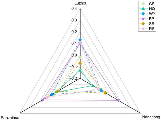 As shown in Table 2 and Figure 10, the changes in the ESDR of the three types of resource-based cities over the past two decades under the influence of urbanization demonstrate distinct patterns. In the declining city of Luzhou, WY exhibited the greatest growth, increasing from 0.084 to 0.214, representing a rise of 0.13. FP and RS also increased by approximately 0.11 each. However, CS decreased slightly, while HQ exhibited the largest decline (−0.134). SR degraded most markedly (−0.07), decreasing from 0.017 to −0.053, shifting from surplus to deficit. These changes may be attributed to Luzhou’s prolonged pressure from resource extraction and the lack of effective economic transformation, which led to substantial degradation in regulating and supporting services. However, provisioning services, including WY, were partly sustained through mine reclamation and ecological restoration initiatives in the upper Yangtze River basin. In the growing city of Nanchong, FP demonstrated the largest improvement, increasing from 0.179 to 0.359 (+0.18). SR also recovered from −0.002 to 0.048, transitioning from a deficit to surplus, while WY showed a slight increase of 0.01. In contrast, CS, HQ, and RS all decreased to varying degrees. This reflects the impact of the expanding Chengdu-Chongqing urban agglomeration on Nanchong, where rapid urban expansion has compressed ecological space, resulting in a decline in most ESDR values. In the mature city of Panzhihua, the overall improvement in ESs was the most significant. CS and HQ increased by 0.11 and 0.04, respectively. RS showed a notable enhancement (+0.13), while FP and WY increased by 0.17 and 0.08, respectively. SR rose from −0.006 to 0.018. These improvements benefited from Panzhihua’s industrial restructuring, development of clean energy and ecotourism, and implementation of ecological projects, such as the restoration of wetlands along the Jinsha River, resulting in an overall enhancement of ESs.