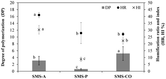 Mean values of degree of polymerization (DP), humification ratio (HR), and humification index (HI) for spent mushroom substrates (SMS-A, SMS-P, and SMS-CO). Bars indicate standard deviation (n = 6). Different letters in each parameter show significant differences (p < 0.05).