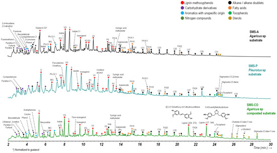 A conspicuous pattern of methoxyphenols (11 phenol index) is observed, suggesting the presence of lignin in the early stages of microbial transformation [59]. This corresponds to the low ratios between guaiacol and syringol and, in general, between all syringyl-type methoxyphenols with respect to guaiacyl-type ones, although it is lower in the case of the recomposted Agaricus substrate.