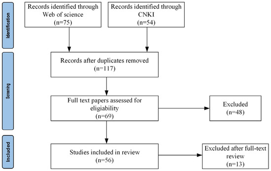Only peer-reviewed journal articles were considered, and literature languages were restricted to Chinese and English. Initial retrieval yielded 129 publications, which were screened based on title and abstract, followed by full-text assessment. Then, we rigorously screened studies that performed quantitative analyses of ESs with clearly defined spatial scopes and region-specific ES estimations. As a result, 56 methodologically sound and thematically relevant studies were included in the final review. The inclusion criteria were as follows: (1) the study explicitly targeted Northeast China, including various spatial scales such as watersheds, provinces, cities, or counties; (2) the research addressed at least one of the following themes: ES type identification, spatiotemporal pattern analysis, trade-off and synergy relationships, driving mechanisms, or regulatory strategies, and must include quantitative metrics for at least one type of ES; (3) the study employed ecological modeling tools or provided policy-oriented insights or recommendations; (4) excluded were non-empirical policy commentaries, conference abstracts, and instructional materials. Literature quality was ensured by giving preference to papers published in SCI-indexed journals, core CSSCI journals, or highly cited works. The full review and screening process is illustrated in Figure 2.