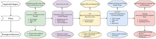 Building on the identification of ES types, their spatial and temporal patterns, and the trade-offs and synergies among them, the development of well-informed and scientifically grounded regulation strategies has become central to supporting the healthy functioning of regional ecosystems. In recent years, the focus of ES research has gradually shifted from merely mapping service patterns to actively exploring strategies for intervention and regulation, particularly in Northeast China. With the ongoing implementation of China’s national ecological civilization strategy, both academic research and policy practices related to ES regulation have continued to advance and deepen [36,37,58]. At present, existing studies usually formulate regulation programs for ESs from three technical paths: (1) In regional classification and management based on the spatial distribution characteristics of ESs, tools such as InVEST, ES cluster, and GTWR are commonly used to identify high-value service areas, zones of potential conflict, and regions experiencing service degradation. These areas are then categorized and managed according to their spatial and temporal dynamics. For example, Hang et al. [91] also employed clustering and regional classification techniques to divide the Songnen Plain into four categories: core advantageous areas, stable maintenance areas, transitional adjustment areas, and high-risk areas. This zoning framework offers valuable insights for planning agricultural and ecological interventions across regions. (2) Optimization and regulation pathways based on the matching between ES supply and demand have gradually developed into a systematic methodology in research on Northeast China. For example, spatial matching analyses using outputs from the InVEST model are commonly used to compare service supply with human demand, while mismatched areas are identified through correlation analysis and spatial clustering. These approaches help inform ecological compensation mechanisms and guide strategies for land use optimization [12,53]. Jin et al. [55] suggested incorporating mismatch indicators into the decision-making framework for constructing ecological value chains, in order to support regional management and the design of compensation policies. (3) To compare the response trends of ESs under different policy intervention pathways by constructing scenario-based simulation and prediction models, thereby providing multiple options to support informed decision-making, Jiang et al. [92] applied multi-objective planning (MOP) and the PLUS model to simulate spatial variations in ES values (water yield, soil conservation, and carbon storage) under different scenarios in Heilongjiang Province from 2000 to 2035. This approach enabled a comparative assessment of policy pathways, such as ecological priority versus economic priority, to support more precise analysis and decision-making. As a key external driver of ESs, policy interventions play a significant moderating role in Northeast China. In recent years, both central and local governments have introduced a range of policies aimed at ecological protection and agricultural management. These include the Returning Farmland to Forests Project, the Black Soil Protection and Utilization Plan, the Northeast Ecological Barrier Construction Initiative, the Green Agriculture Development Policy, and the Ecological Red Line Delineation Program. By adjusting land use structures, limiting high-intensity development, and promoting environmentally friendly production practices, these policies have contributed to enhancing the region’s ecological regulatory functions and the sustainable provision of ESs. Figure 3 illustrates the relationships between major ecological policies, their applicable regions, implementation timelines, ecological objectives, and associated ESs in Northeast China.