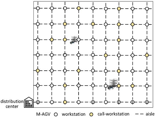 The scheduling problem for heterogeneous M-AGV fleets involves the following elements: a distribution center (i.e., the material warehouse), a heterogeneous fleet of M-AGVs with different load capacities, and material request workstations (i.e., workstations within the workshop that require material delivery). A simplified layout of the manufacturing workshop is illustrated in Figure 1.