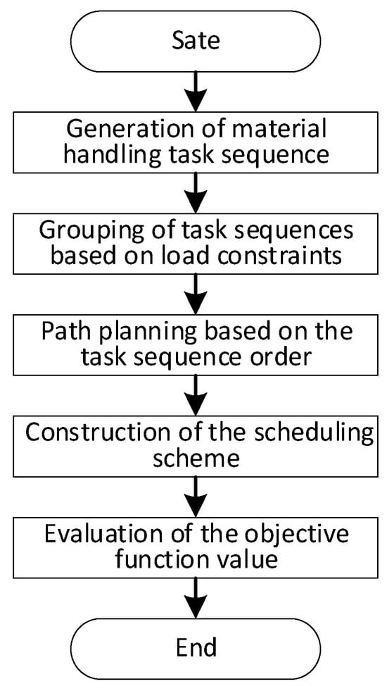 - Objective Evaluation. Taking into account AGV types, task allocation, and path planning results, the total energy consumption of all AGVs (i.e., the objective function value) is calculated to assess the effectiveness of the scheduling solution.