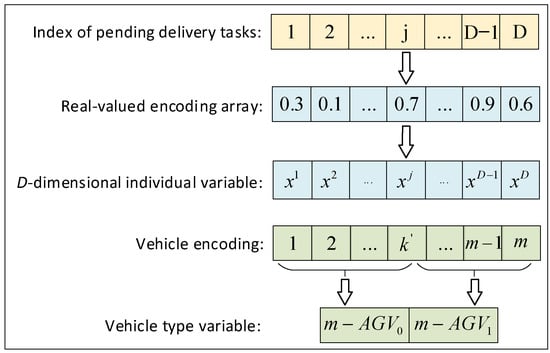 Encoding process of the heterogeneous M-AGVs scheduling problem.