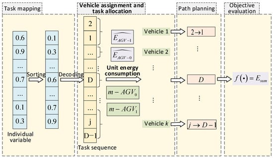 The decoding process involves transforming the task sequence generated by the algorithm into a feasible AGV scheduling solution. During this process, a priority rule based on the unit energy consumption per kilogram of material is introduced to guide vehicle type selection. Specifically, the lower the unit energy consumption for transporting one kilogram of material, the better the vehicle–task matching. The decoding procedure is illustrated in Figure 5.