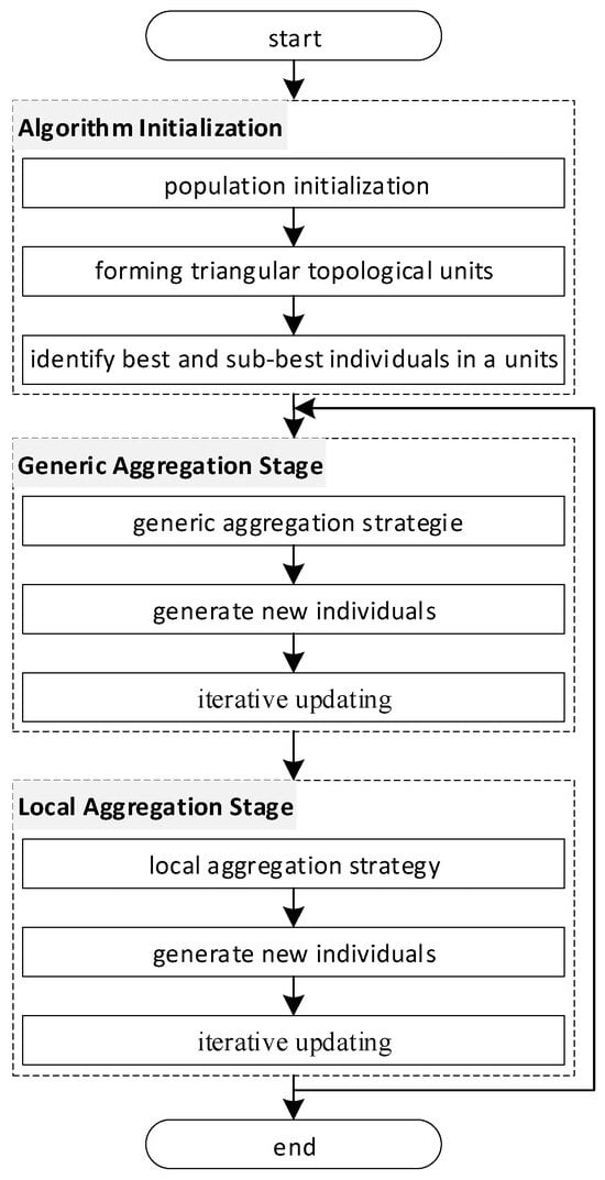 In recent years, swarm intelligence optimization techniques have garnered significant attention due to their exceptional performance in solving NP-hard problems. In 2023, Zhao et al. first proposed the Triangulation Topology Aggregation Optimizer (TTAO) [24], whose operation consists of three key phases: algorithm initialization, the generic aggregation process, and the local aggregation process, as illustrated in Figure 6. This algorithm integrates the mathematical principles of similar triangle topology with the search mechanisms of metaheuristic algorithms, breaking through the limitations of traditional single-/dual-population evolutionary paradigms and significantly improving individual optimization efficiency. However, in the generic aggregation phase of TTAO, the generation of new individuals relies solely on learning from the best individual within the topological unit, which tends to bias the search process and increase the risk of premature convergence to local optima [27]. To address this limitation, this study proposes a novel similarity-based generic aggregation strategy built upon the TTAO framework. The proposed strategy considers both individual similarity and fitness, leveraging the multi-dimensional characteristics of individuals in TTAO. The triangular topology unit in the TTAO algorithm is illustrated in Figure 7.