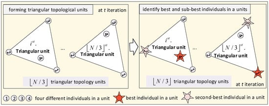 where denotes the suboptimal individual of the triangular topology unit i at iteration t, and and represent the corresponding fitness function value of each individual.