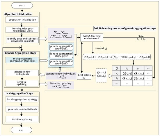 The SARSA learning algorithm is a representative on-policy reinforcement learning method, in which the actions ultimately executed by the agent are consistent with those selected during the learning process [28]. Leveraging this characteristic, this study integrates the SARSA algorithm into the generic aggregation phase of the Triangulation Topology Aggregation Optimizer (TTAO) to enhance its optimization capability. In this phase, SARSA dynamically selects the most appropriate aggregation strategy based on feedback from a reward function to generate new individuals. This strategy selection mechanism helps the algorithm avoid local optima while enabling more effective exploration and exploitation of the search space, thereby significantly improving the efficiency of solving complex optimization problems. The integrated framework of the SARSA-TTAO algorithm is illustrated in Figure 8.