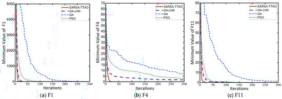 Based on the results shown in Figure 8 and Table 2, the proposed SARSA-TTAO algorithm demonstrates clear performance advantages across all three benchmark functions—F1, F4, and F11—with varying levels of complexity. The algorithm achieves rapid convergence to high-quality solutions in the early stages of iteration and maintains relatively stable performance throughout the process. Specifically, for all three functions, SARSA-TTAO is able to approach near-optimal solutions within approximately 25 iterations. Moreover, it consistently outperforms GA-LNS, GA, and PSO in terms of best solution quality, and for the highly complex F11 function, it successfully identifies the global optimum and demonstrates a high degree of robustness. Although SARSA-TTAO exhibits relatively higher computational time, the total runtime remains under 1 s, suggesting good practical feasibility. These results collectively verify the effectiveness of the SARSA-TTAO algorithm.