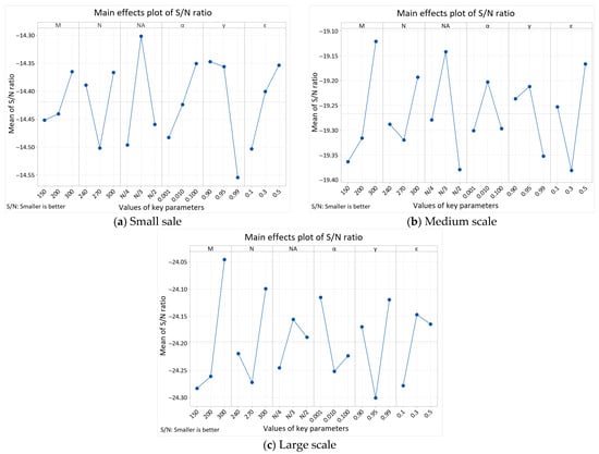 Since the objective function in this study aims to minimize energy consumption, the “smaller-the-better” signal-to-noise (S/N) ratio formula was adopted in the Taguchi experiments. Taking the energy-efficient scheduling problem of heterogeneous multi-load AGVs as an example, the S/N response diagrams of parameter factors for the SARSA-TTAO algorithm are shown in Figure 10.