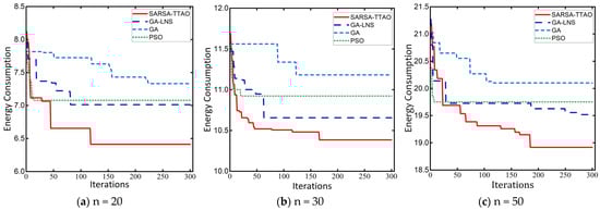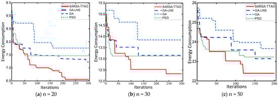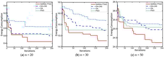 Each test case of different scales was independently run 20 times, and the average values were used to eliminate random errors. Figure 11, Figure 12 and Figure 13 illustrate the iteration trends of the four algorithms—SARSA-TTAO, GA-LNS, GA, and PSO—when solving the energy-efficient scheduling problems for heterogeneous, homogeneous light-load, and homogeneous heavy-load M-AGV fleets, respectively. All experiments include small, medium, and large-scale instances. Table 7 presents the best energy consumption results (in kilojoules) for each problem type and the corresponding vehicle usage.