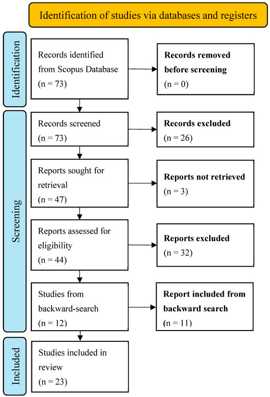 The initial assessment of the literature was based on the title and abstract. To ensure internal validity, each author conducted the assessment independently. Based on the screening of titles and abstracts, and the inclusion and exclusion criteria in Table 2, 41 articles were initially classified as “suitable”, 6 articles as “possibly suitable”, and 26 studies as “not suitable”. After re-examination, the 6 articles previously rated as “possibly suitable” were categorized as “suitable”. For the full-text analysis, 47 publications were classified as “suitable”, although 3 of these had to be excluded because the files could not be accessed. Finally, 44 articles were analyzed using full text analysis, and 12 sources were identified as “suitable”, meeting the criteria in Table 2. In the final stage, a backward search was conducted, which resulted in the identification of a further 11 research papers. After the final analysis, a total of 23 sources were used for content analysis. The selection was also based on the previously defined inclusion and exclusion criteria, which are listed in Table 2.