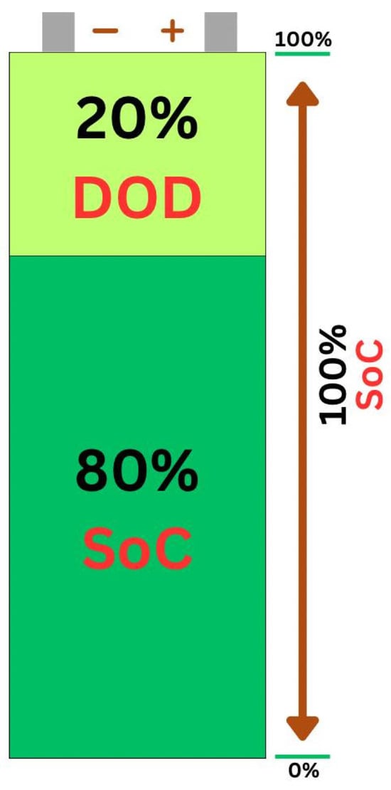A battery energy storage system is utilized to store energy and discharge it when the grid and PV power are unavailable. The storage system mitigates the intermittent nature of the system and improves its reliability and efficiency. The State of Charge of a battery denotes the level of energy stored in it, whereas the Depth of Discharge (DoD) indicates the amount of energy that has been consumed from the battery as illustrated in Figure 2 [54,55]. This proposed system is subjected to the following constraints: