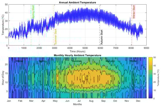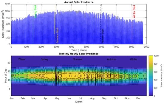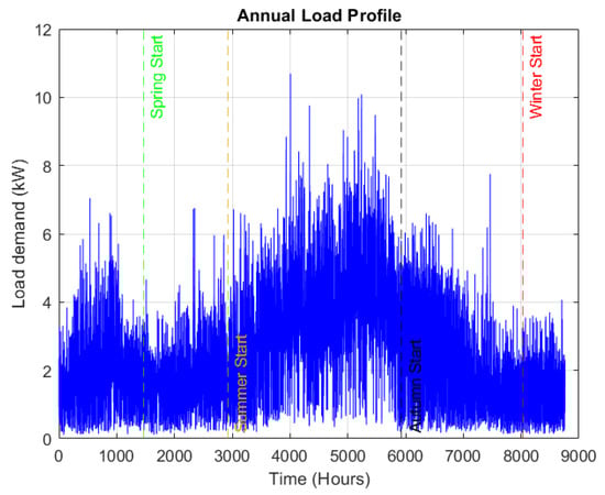 The study area benefits from abundant solar irradiance throughout the year, with peak levels observed in June. The average solar irradiance is highest during the summer, making it the most favorable season for generating electricity from PV systems, followed by spring, autumn, and winter. In winter, most consumers use heaters, while air conditioning is prevalent during the summer. Figure 5 shows the annual load profile of the household on an hourly basis. The analysis of the seasonal data is presented in Table 6, and the daily and monthly solar irradiance data are shown in Table 7.