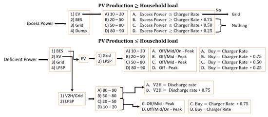 When the electric vehicle is connected to a home through a bidirectional AC/DC converter, it can be utilized in Vehicle-to-Home (V2H) mode to improve household reliability. V2H operation can reduce a homeowner’s operating costs, provided there is an effective charging and discharging strategy. However, the level of EV participation in V2H mode depends on customer preferences and the availability of the State of Charge. In this study, the Nissan Leaf EV, equipped with a 40-kWh battery [57], was selected for analysis due to its prominent position in the electric vehicle market [58]. The charging/discharging capacity of the EV’s battery at any hour can be modeled in terms of its rated power as described in Equations (10) and (11), respectively [59,60]: