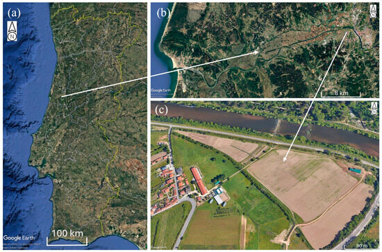 Location of the study site in Portugal (a), in the Lower Mondego Valley (b), and the investigated farm (c) (adapted from Google Earth imagery).
