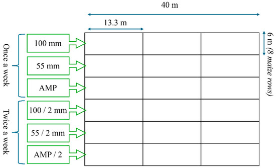 Experimental design illustrating six irrigation treatments, which include three weekly water application levels (100 mm, 55 mm, and the recommendation provided by the maize farm association (AMP)). Each water volume was applied either once or split into two irrigation events per week.