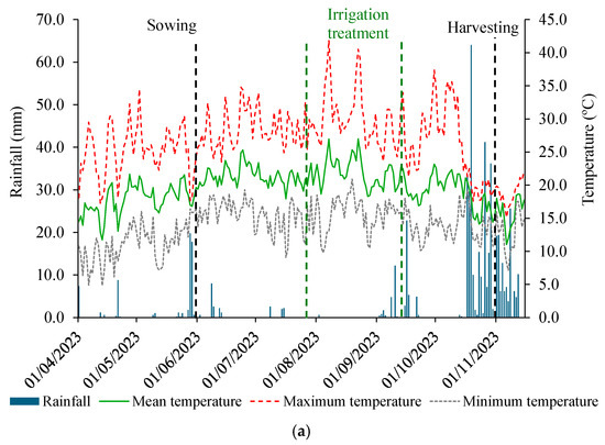 Irrigation was carried out using a drip system, with one pipe per maize row. Water application for each treatment was controlled by flow meters (NATRAIN) installed in the main water pipe distributing water to the individual treatment areas. The irrigation system was operated manually, with water flow initiated and stopped by hand once the target irrigation volume (monitored using flow meters) was reached. The irrigation treatments were implemented from 31 July to 11 September (Figure 3a), lasting seven weeks. Irrigation was applied on Tuesdays across all plots, and additionally on Thursdays for those treatments receiving water twice per week. All irrigation events were conducted in the morning.