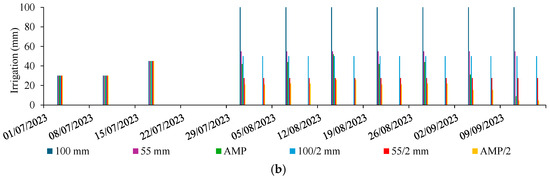 The total amount of water applied in each treatment throughout the study period is presented in Figure 3b. In total, 100 mm and 100/2 mm plots received 805 mm of water irrigation over the study period, while 55 mm and 55/2 mm received 490 mm, and the AMP plots were irrigated with 369 mm.