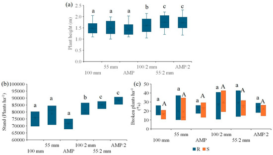 Box plots showing (a) plant height, (b) total number of plants, and (c) number of plants broken at the root (R) or stem (S) across the six irrigation treatments (100 mm: 100 mm applied once a week, 55 mm: 55 mm applied once a week, AMP: weekly irrigation following recommendations from maize farms association, 100/2 mm: 50 mm applied biweekly, 55/2 mm: 27.5 mm applied biweekly, AMP/2: irrigation following recommendations from maize farms association split into two applications per week). Different letters denote statistically significant differences between treatments (p ≤ 0.05).