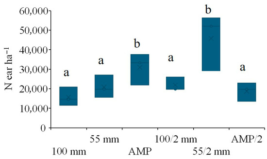 Box plots showing the number (N) of ears across six irrigation treatments (100 mm: 100 mm applied once a week, 55 mm: 55 mm applied once a week, AMP: weekly irrigation following recommendations from maize farms association, 100/2 mm: 50 mm applied biweekly, 55/2 mm: 27.5 mm applied biweekly, AMP/2: irrigation following recommendations from maize farms association split into two applications per week). Different letters denote statistically significant differences between treatments (p ≤ 0.05).