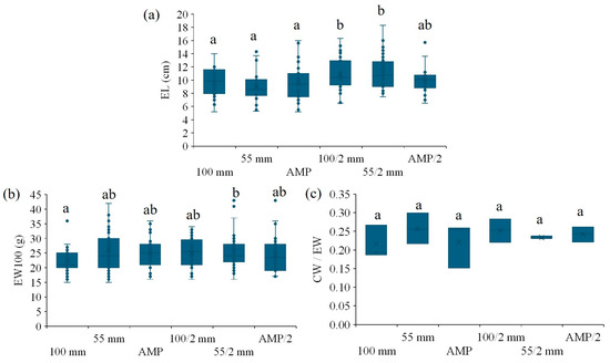Box plots showing (a) ear length (EL), (b) weight of 100 ears (EW100), and (c) ratio between the cob weight (CW) and ear weight (EW) across six irrigation treatments (100 mm: 100 mm applied once a week, 55 mm: 55 mm applied once a week, AMP: weekly irrigation following recommendations from maize farms association, 100/2 mm: 50 mm applied biweekly, 55/2 mm: 27.5 mm applied biweekly, AMP/2: irrigation following recommendations from maize farms association split into two applications per week). Different letters denote statistically significant differences between treatments (p ≤ 0.05).