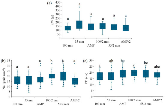 Box plots showing (a) kernel weight (KW), (b) kernel number in an average row of the ear (NC), and (c) kernel depth (KD) across six irrigation treatments (100 mm: 100 mm applied once a week, 55 mm: 55 mm applied once a week, AMP: weekly irrigation following recommendations from maize farms association, 100/2 mm: 50 mm applied biweekly, 55/2 mm: 27.5 mm applied biweekly, AMP/2: irrigation following recommendations from maize farms association split into two applications per week). Different letters denote statistically significant differences between treatments (p ≤ 0.05).