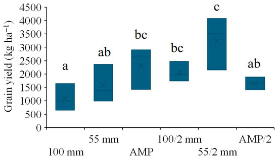 Box plots showing grain yield across six irrigation treatments (100 mm: 100 mm applied once a week, 55 mm: 55 mm applied once a week, AMP: weekly irrigation following recommendations from maize farms association, 100/2 mm: 50 mm applied biweekly, 55/2 mm: 27.5 mm applied biweekly, AMP/2: irrigation following recommendations from maize farms association split into two applications per week). Different letters denote statistically significant differences between treatments (p ≤ 0.05).