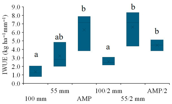 Box plots showing irrigation water use efficiency (IWUE) across six irrigation treatments (100 mm: 100 mm applied once a week, 55 mm: 55 mm applied once a week, AMP: weekly irrigation following recommendations from maize farms association, 100/2 mm: 50 mm applied biweekly, 55/2 mm: 27.5 mm applied biweekly, AMP/2: irrigation following recommendations from maize farms association split into two applications per week). Different letters denote statistically significant differences between treatments (p ≤ 0.05).